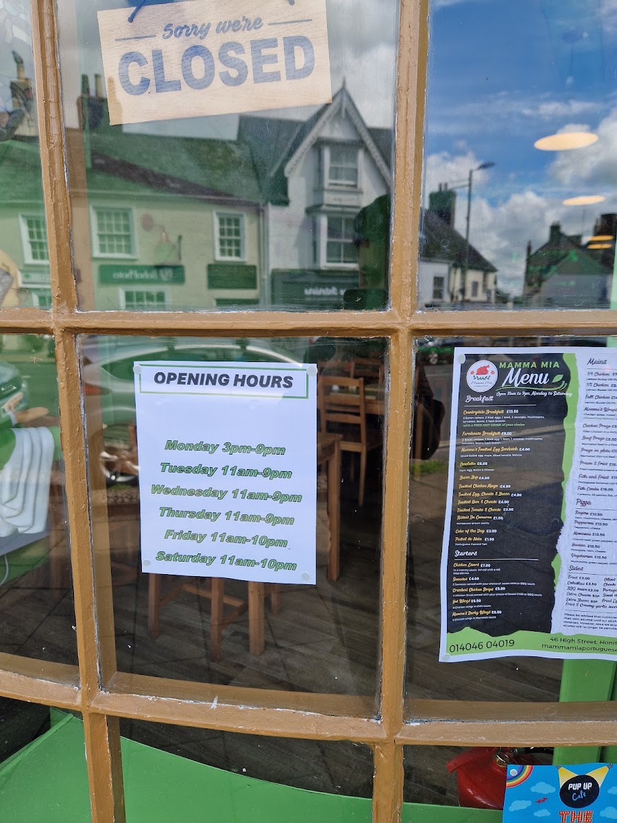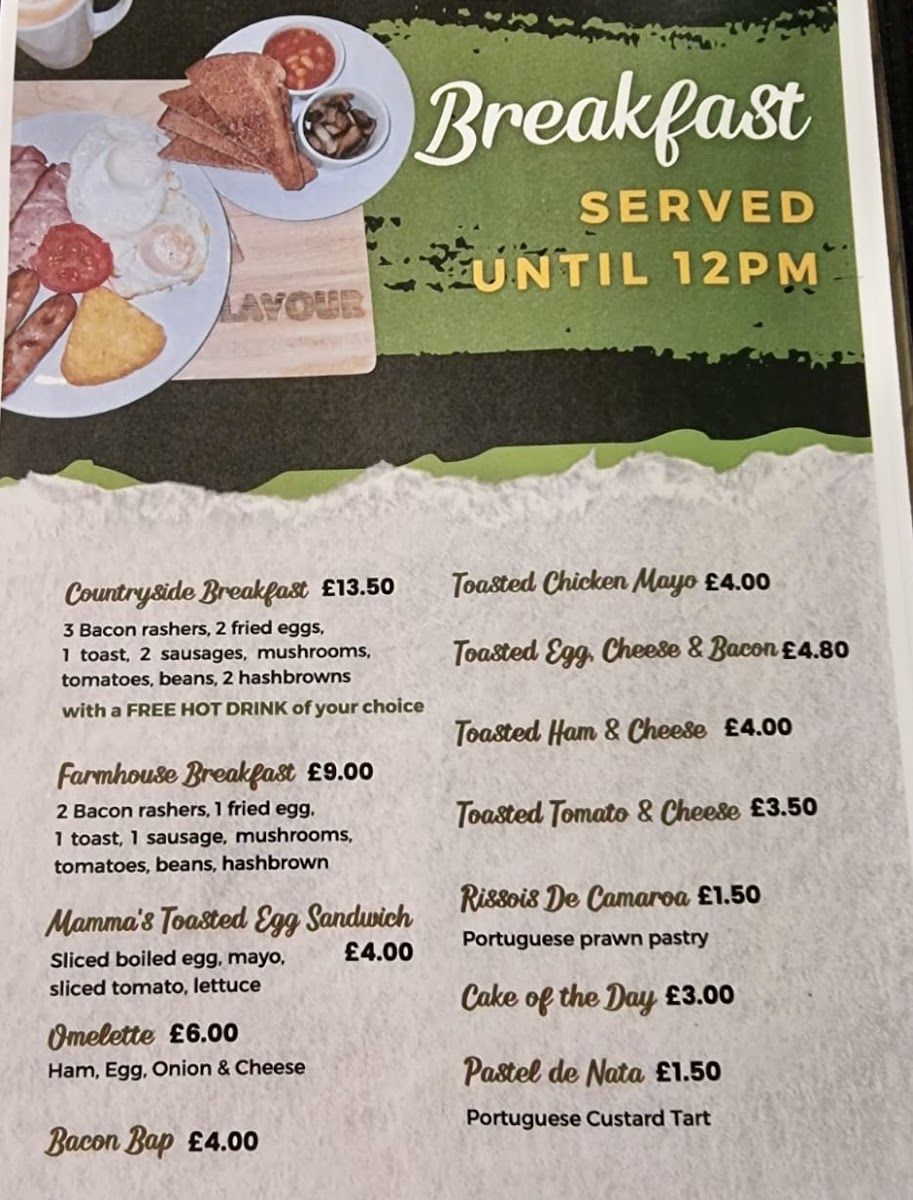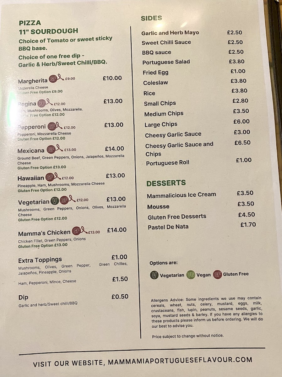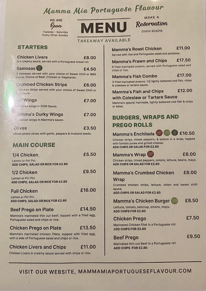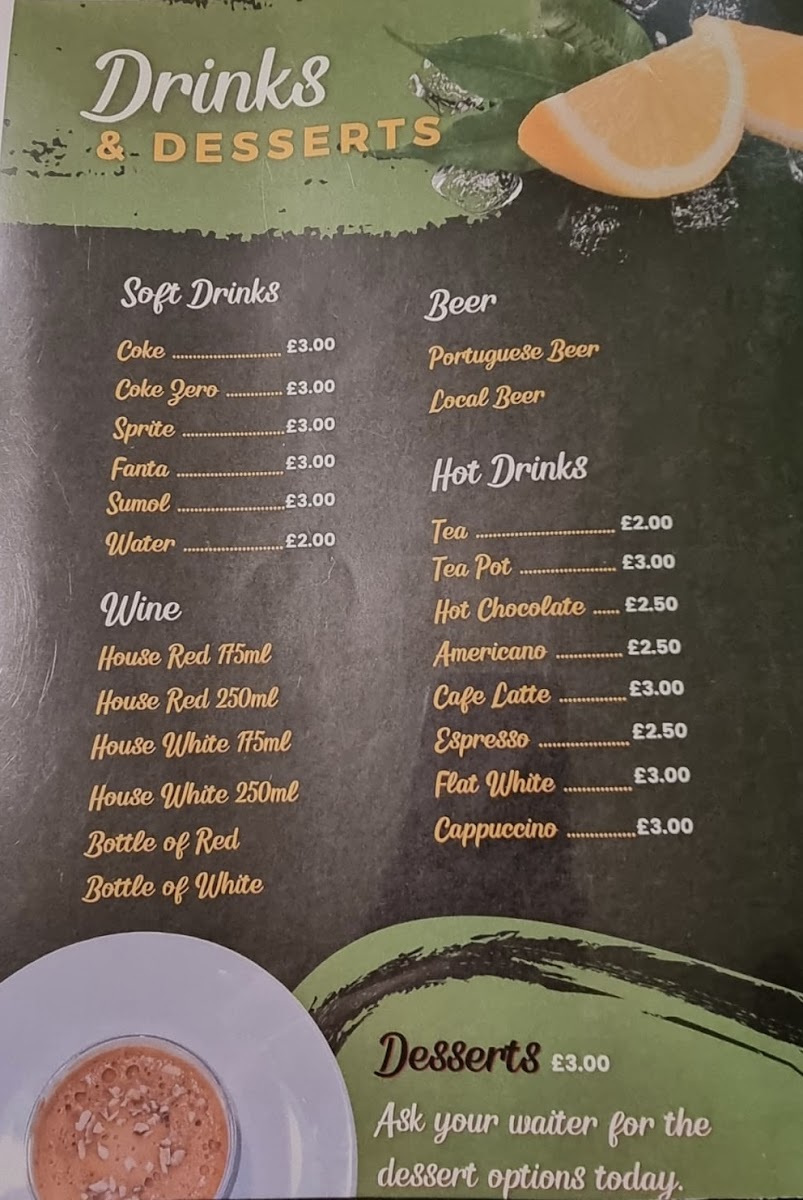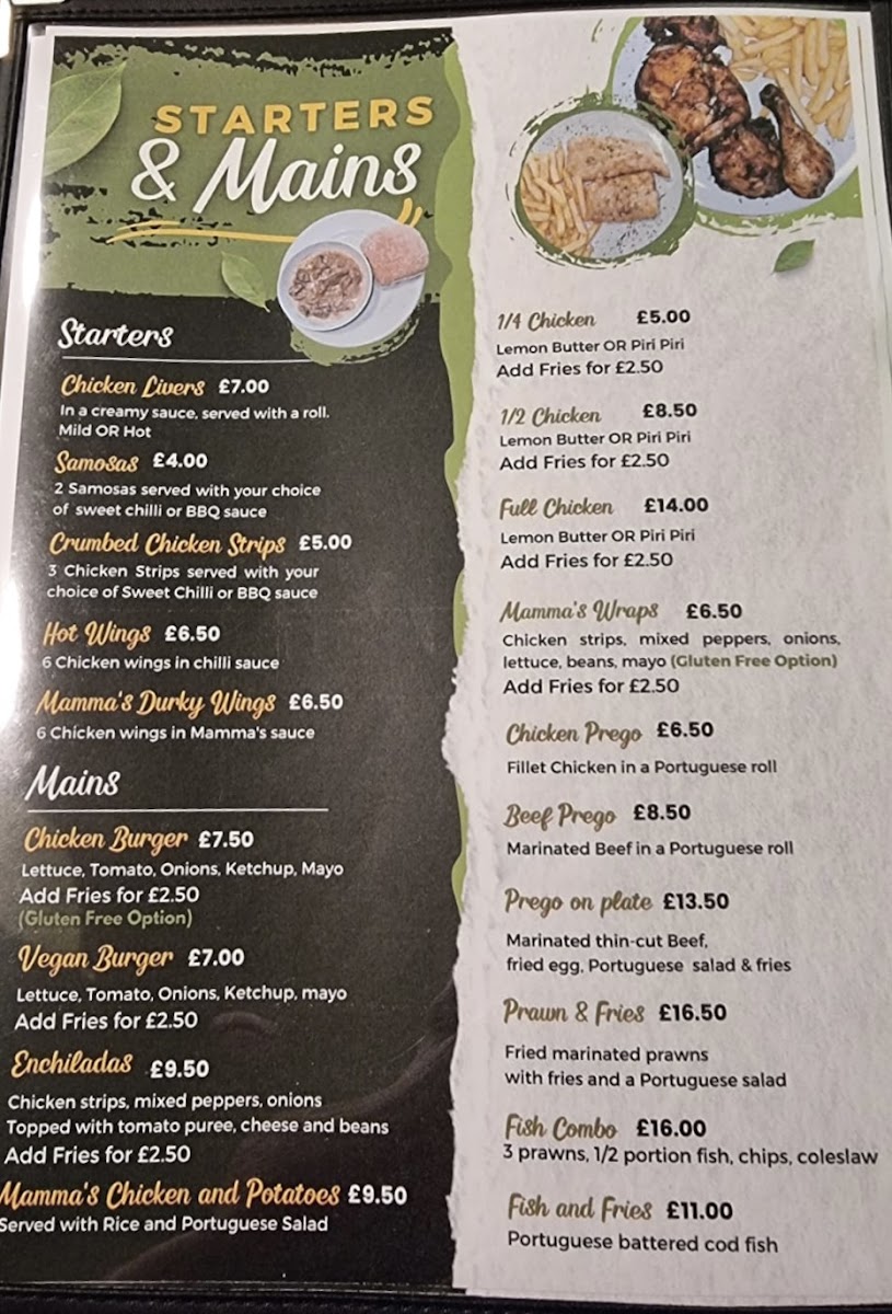 The menu at Mamma Mia Portuguese Flavour offers a delightful array of traditional Portuguese dishes along with some familiar favorites. For starters, you can enjoy Chicken Livers, Mamma's Roast Chicken, or Samosas, priced alongside other tempting options like Crumbed Chicken Strips and Mamma's Prawn and Chips. The main course offers generous portions, with options like the 1/4 Chicken, 1/2 Chicken, and Full Chicken, or the savory Beef Prego on Plate and Chicken Prego on Plate. If you're in the mood for something lighter, the Mamma's Enchilada, Mamma's Wrap, and Mamma's Chicken Burger provide satisfying alternatives. The burger and wrap selection also includes a Vegan Burger and Enchiladas, catering to different tastes. For breakfast, guests can indulge in hearty choices such as the Countryside Breakfast, Farmhouse Breakfast, or the classic Mamma's Toasted Egg Sandwich, while lighter bites like a Bacon Bap or Omelette are also available. Sides include classic Garlic and Herb Mayo, Sweet Chilli Sauce, and the refreshing Portuguese Salad, making for a satisfying complement to any meal. Don't forget to try the delicious desserts like the Mammalicious Ice Cream or the iconic Pastel De Nata for a sweet finish. For drinks, the restaurant offers a range of soft drinks such as Coke and Sprite, as well as House Red and House White wines, perfect for pairing with your meal. The beer selection features refreshing Portuguese Beer and local brews, rounding out a menu that provides a little something for everyone.